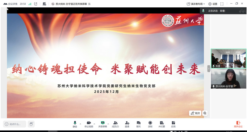 12月30日下午,米兰·体育官方网站召开样板党支部建设专题辅导会,特邀全国高校“百个研究生样板党支部”苏州大学纳米科学技术学院研究生纳米生物党支部书记孙宇慧做建设经验分享,学院党委副书记、副院长殷春华主持会议。